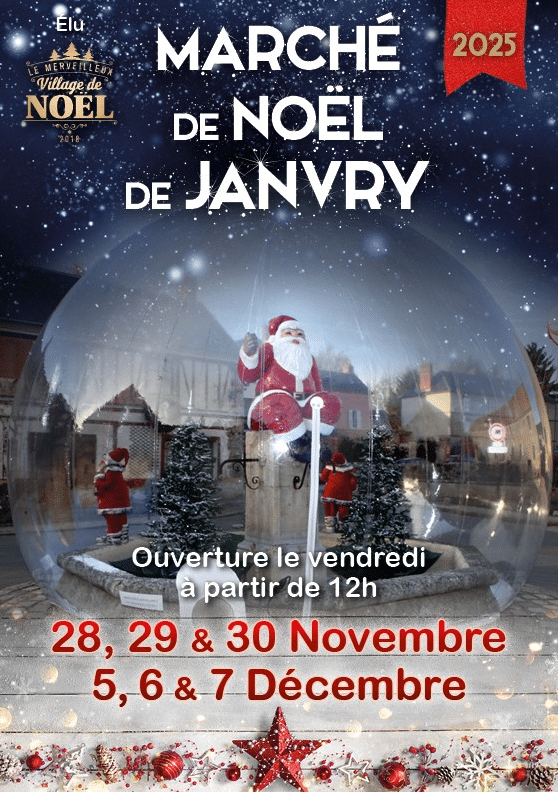 05/12 2025 au 07/12/2025 Marché de Noel de Janvry Vendredi 05/12 : 12h-20h Samedi 06/12 : 10h-19h Dimanche 07/12 : 10h-19h Retrouvez toutes les informations du marché de Noël de Janvry ci dessous : https://janvry.fr/animations/le-marche-de-noel-de-janvry/